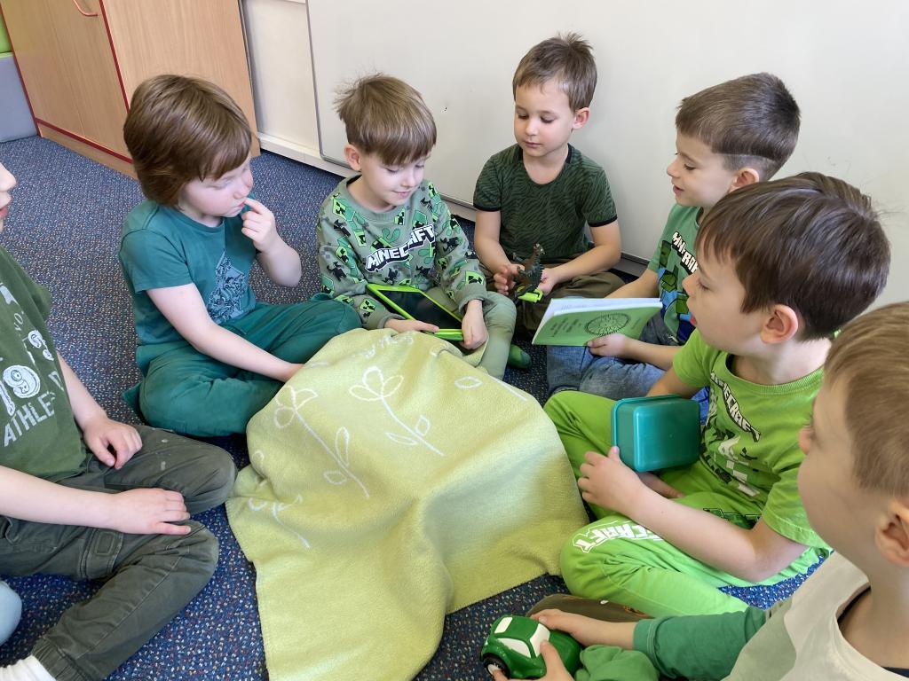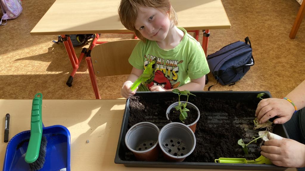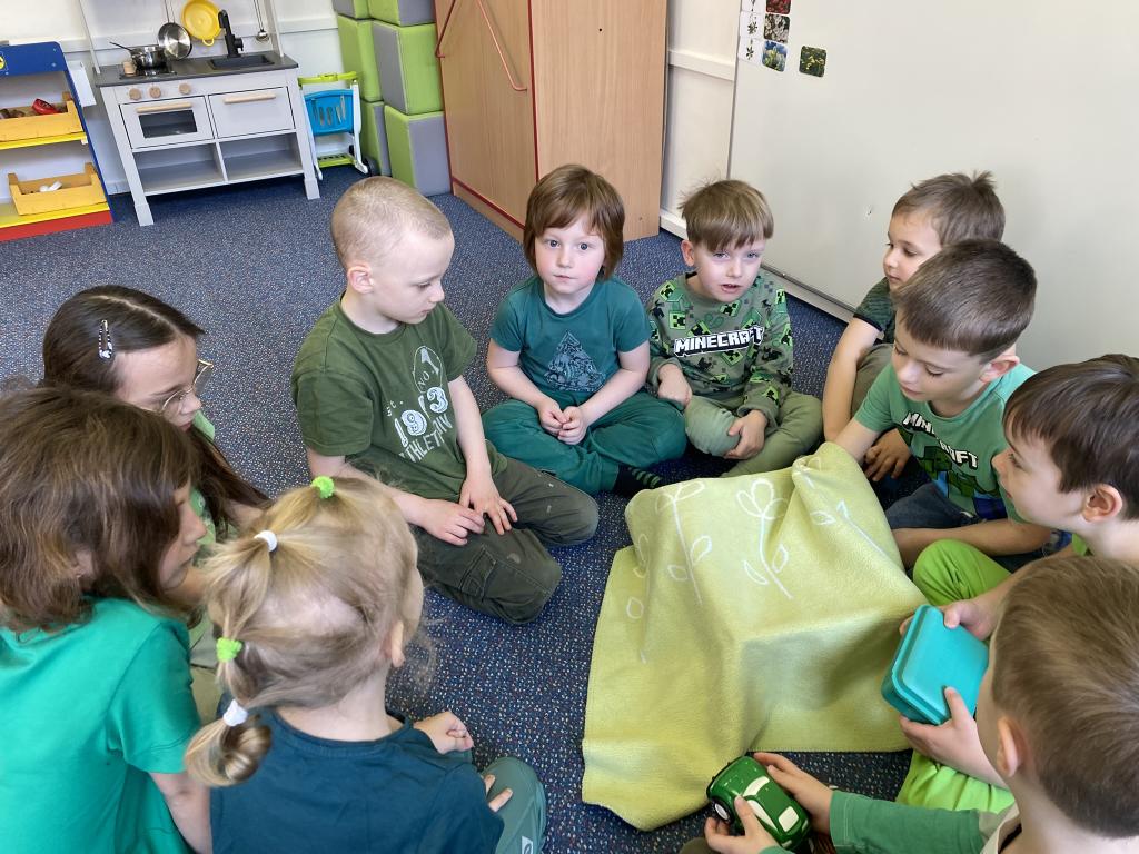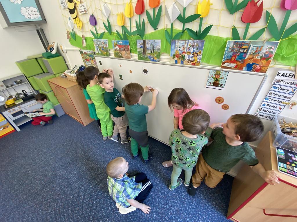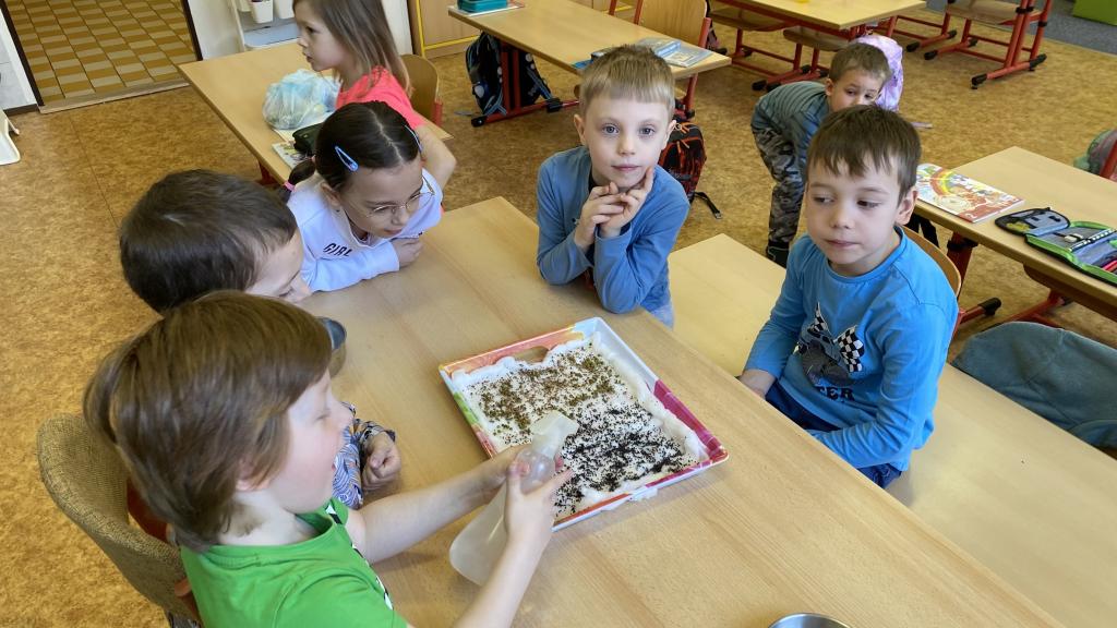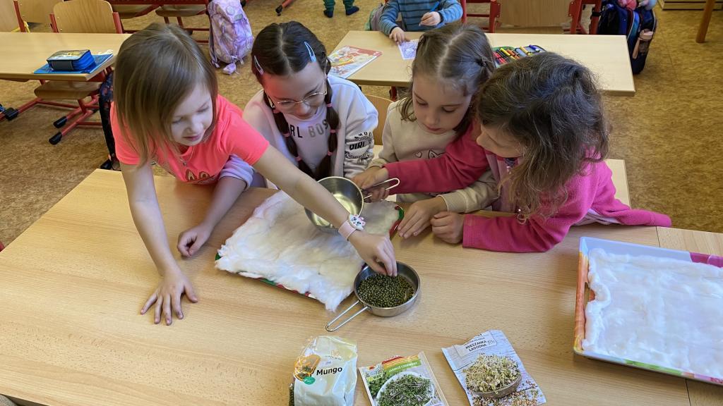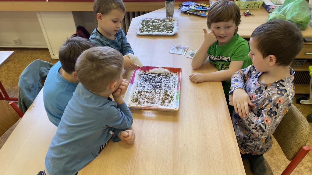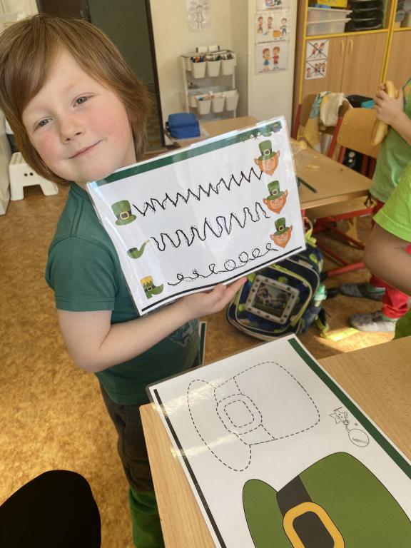 V pondělí 16. března odstartoval projektový týden, který rozzářil nejen naše přípravné třídy, ale i celou školu barvami jara. Objevování, dobrá nálada a společné aktivity nás těšily celý týden. Děti chodily v zeleném oblečení a přinesly dokonce i zelené svačiny, které jim moc chutnaly. Jako všechny učebny ve škole, tak i naše dostaly symbolický jarní klíč, který se objevil na dveřích naší třídy. Nebyl to obyčejný klíč — reagoval na splněné jarní výzvy. A že jich bylo! S dětmi jsme se starali o rostlinky – vyseté hrášky a fazolky. Děti měly radost, jak vše klíčí a roste. Po přesazení do hlíny si děti odnesly zelené květináčky domů. Na vatu jsme nechali také vyklíčit kadeřávek, čočku a mungo klíčky, na kterých jsme si s radostí po týdnu pěstování všichni pochutnali. Ve třídě jsme dělali další pestré aktivity spojené se zeleným týdnem – modelovali jarní obrázky, zpívali písničky o jaru, kreslili, vyráběli, četli příběhy a hráli si. Povídali jsme si o svátku svatého Patrika a plnili úkoly skřítka Leprikóna. Na památku jsme si namalovali kouzelné trojlístky, které nám budou připomínat důležité mezilidské hodnoty, jakými jsou láska, přátelství a pomoc druhým. Zelený týden jsme si všichni moc užili. Doufáme, že nám přinesl nejen radost, ale i zdraví a plno jarní energie!