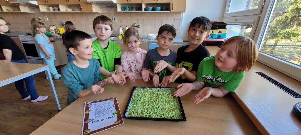 Ve čtvrtek 19. března jsme se s druháčky rozhodli, že se na jeden den proměníme v cukráře a upečeme si vlastní ovocný koláč. A protože celý týden probíhal v duchu zelené barvy, bylo jasno, i náš koláč bude zelený. Nejprve jsme si v hodině českého jazyka společně přečetli recept, povídali si o potřebných surovinách i pracovním postupu. A aby to nebyla nuda, zkusili jsme si postup předvést i pomocí pantomimy, takže jsme rozťukávali vajíčka, míchali těsto a sypali mouku „na sucho“, ale o to nadšeněji.