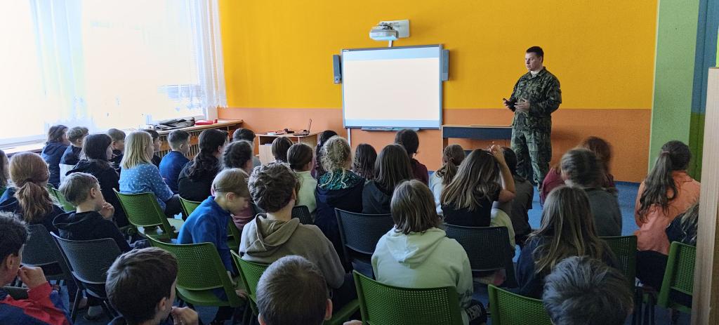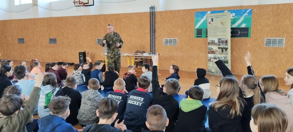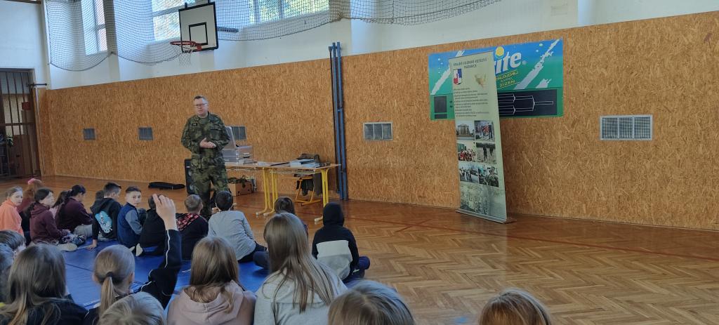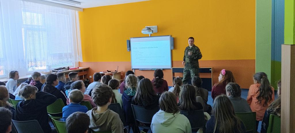 2. v prostorách tělocvičny jsme si vyslechli přednášku o ARMÁDĚ ČESKÉ REPUBLIKY, doplněnou o různé dotazy a odpovědi z řad žáků.